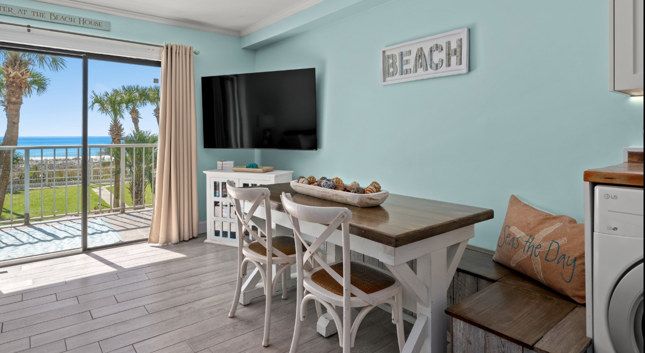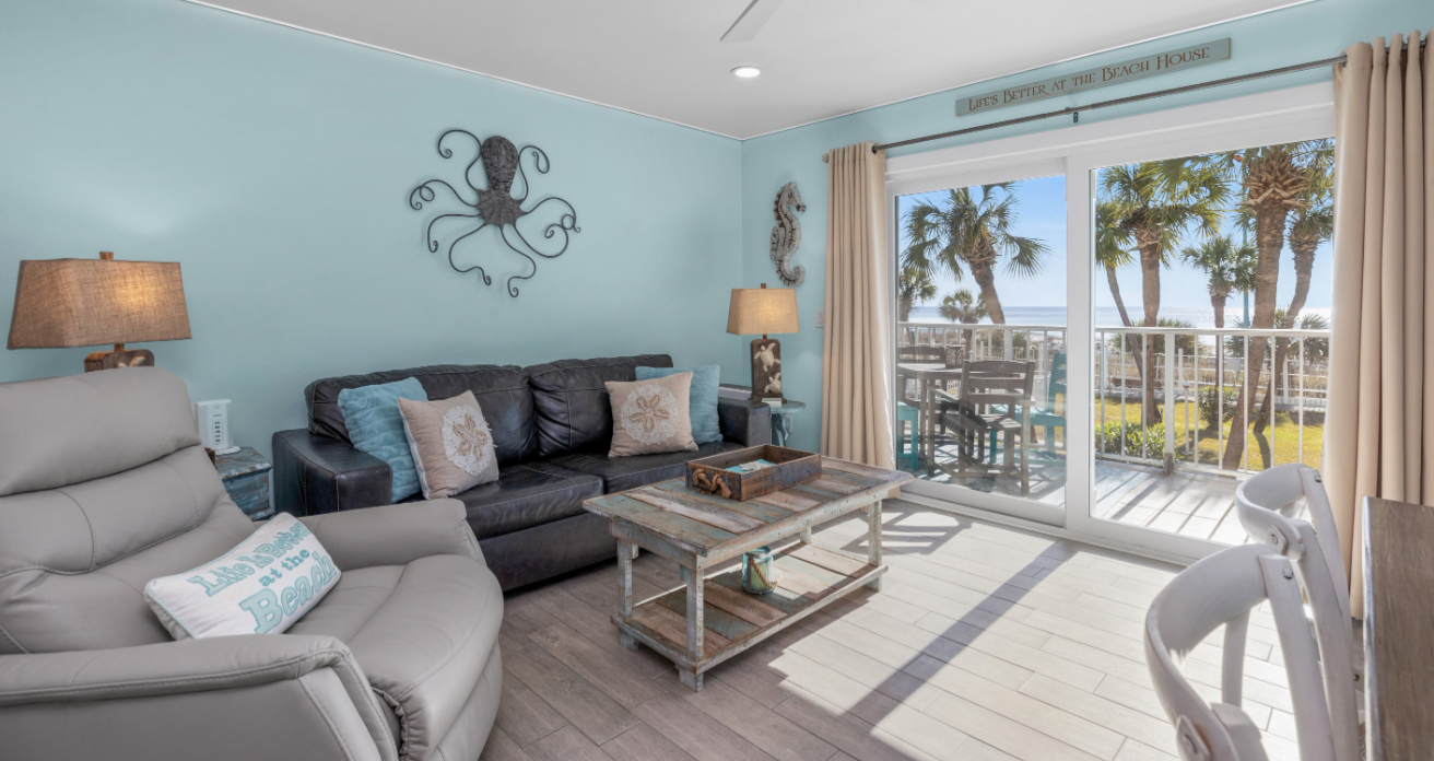 At Hidden Treasures, up to five guests will enjoy a Gulf-front living area with a private balcony and stunning beach views. The sleeper sofa offers a memory foam mattress, additional seating is available to enjoy the views, and a 65” smart TV adorns the wall.