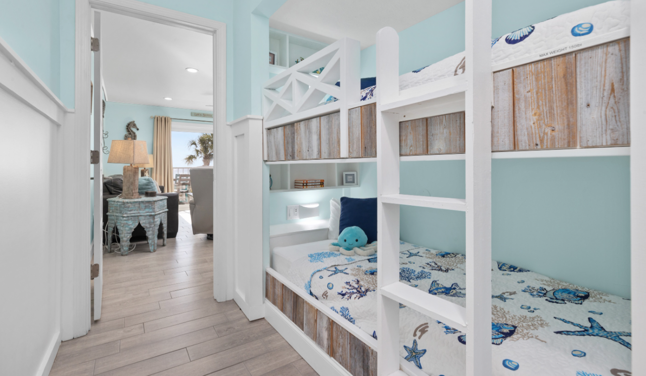 Our cute bunk area features two twin beds, each with a shelf, light & USB port.